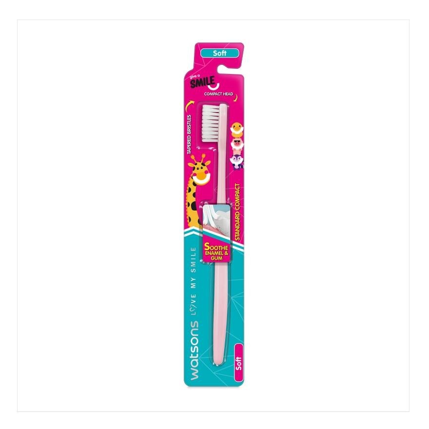 Watsons Oral Care range provides a high standard of all-round protection for your teeth and gums. Watsons Standard Compact Toothbrush (Soft) 1 pc (Gift a Smile project) Tapered bristles help effective yet gentle cleaning. Compact head effectively reaches and cleans back teeth.