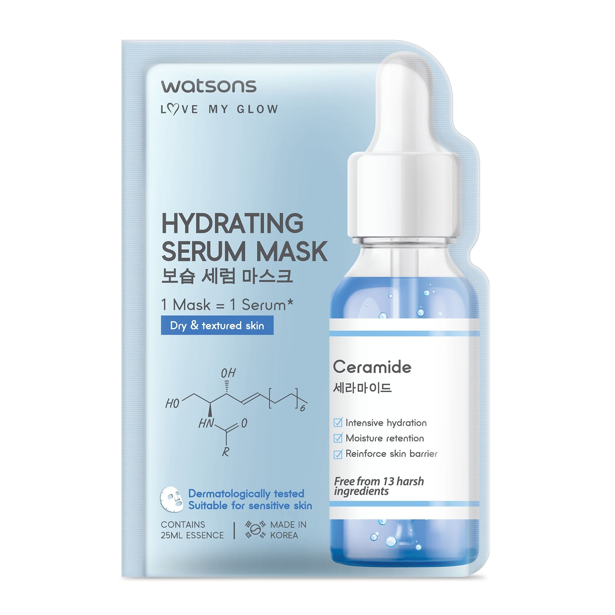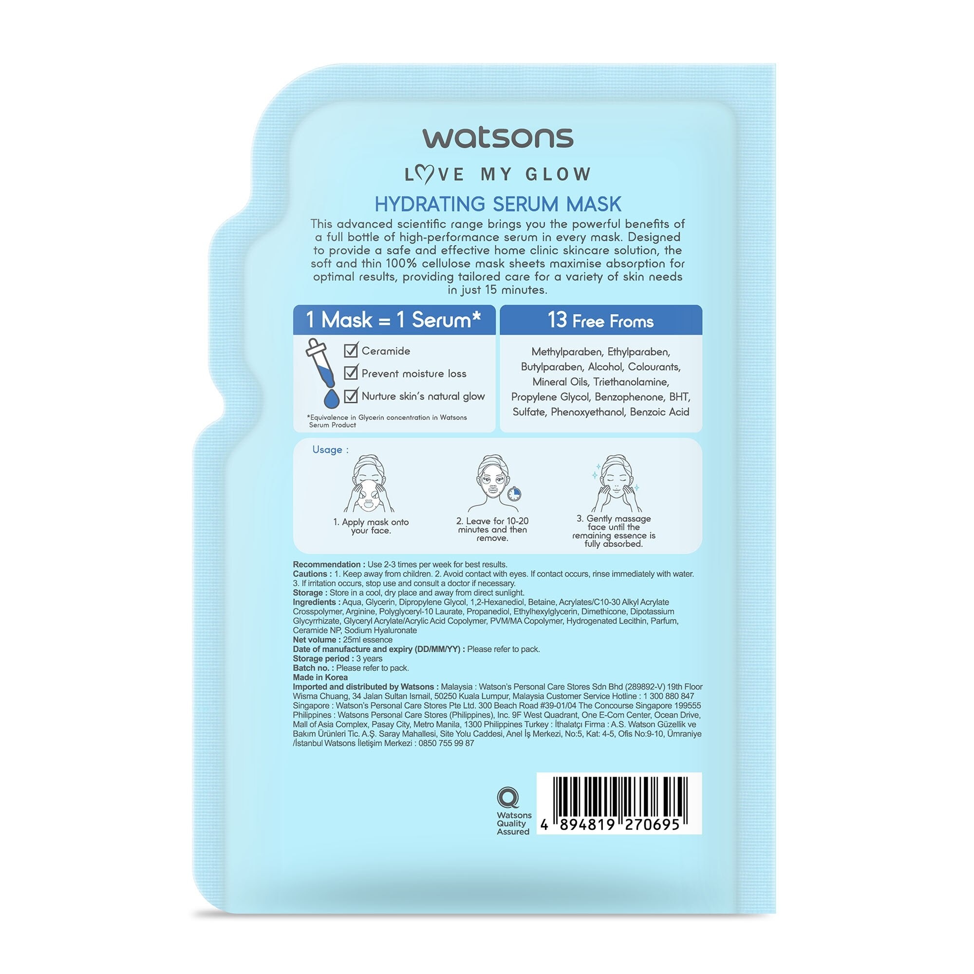 Watsons Hydrating Serum Mask is advanced scientific range brings you the powerful benefits of a full bottle of high-performance serum in every mask. Desgined to provide a safe and effective home clinic skincare solution, the soft and thin 100% cellulose mask sheets maximise absorption for optimal results, providing tailored care for a variety of skin needs in just 15minutes. Contain Ceramide help to intensive hydration, moisture retention and reinforce skin barrier. Suitable for sensitive skin. Dermatologically tested and Free from 13 harsh ingredients.