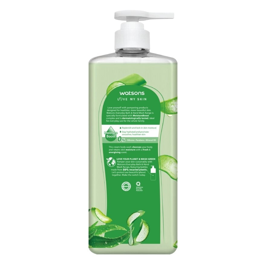 Watsons Aloe Vera Scented Cream Body Wash.Watsons Love My skin Love yourself with pampering Products designed for healthier, more beautiful skin. Watsons Everyday Bath amp; Hand Wash Range is specially formulated with MoistureBoost complex and is dermatologically tested, ideal for everyday use for the whole family. Caution : Keep out of reach of children. Avoid contact with eyes. If contact occurs, rinse immediately with water. If any irritation occurs, discontinue use and consult a doctor if necessary.