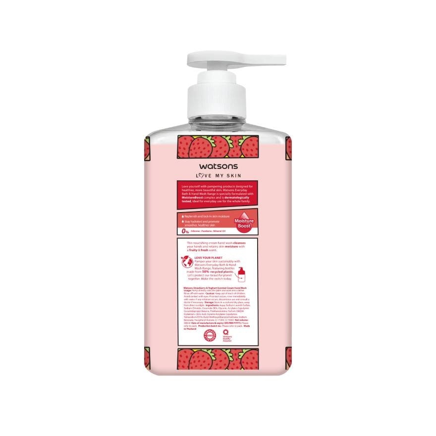 Watsons Love My Skin Love yourself with Pampering products designed for healthier, more beautiful skin. Watsons Everyday Bath & Hand Wash Range is specially formulated with MoistureBoost complex and is dermatologically tested, ideal for everyday use for the whole family. Replenish and lock-in skin moisture Stay hydrated and promote smoother, healthier skin 0% — Sillicone — Parabens — Mineral oil This nourishing cream hand wash cleanses your hands and retains skin moisture with a fruity & fresh scent. Love your planet Pamper your skin sustainably with Watsons Everyday Bath & Hand Wash Range, featuring bottles made form 50% recycled plastic. Let’s protect our beautiful planet together. Make the switch today.