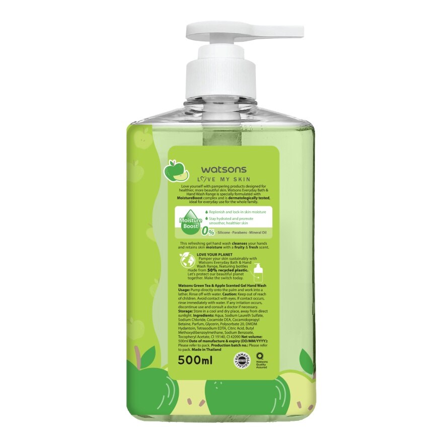 Watsons Green Tea & Apple Scented Gel hand wash Love yourself with pampering products designed for healthier, more beautiful skin. Watsons Everyday Bath & Hand Wash Range is specially formulated with MoistureBoost complex and is dermatologically tested, ideal for everyday use for the whole family.Moisture Boost Replenish and lock-in skin moisture. Stay hydrated and promote smoother, healthier skin.This refreshing gel hand wash cleanses your hands and retains skin moisture with a fruity & fresh scent.Love your planet Pamper your skin sustainably with Watsons Everyday Bath & Hand Wash Range, featuring bottles made from 50% recycled plastic. Let’s protect our beautiful planet together. Make the switch today. This product was formulated without over 20 unwanted ingredients.