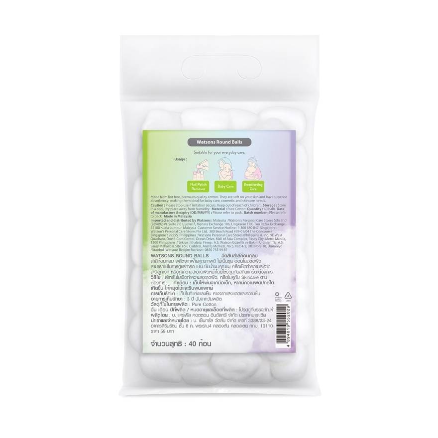 Watsons Round Balls is made from lint free premium quality cotton. They are soft on your skin and have superior absorbency, making them ideal for baby care, costmetic and skincare needs. Quantity 40 balls.