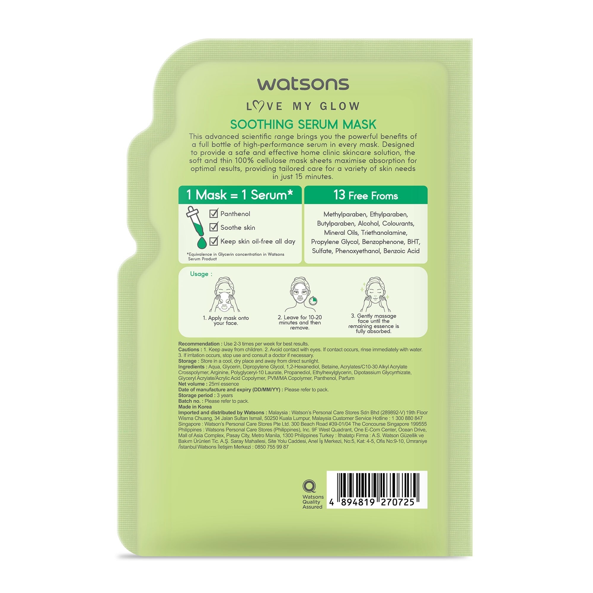 Watsons Soothing Serum Mask is advanced scientific range brings you the poweful benefits of a full bottle of high-performance serum in every mask. Designed to provide a safe and effective home clinic skincare solution, the soft and thin 100% cellulose mask sheets maximise absorption for optimal results, providing tailored care for a variety of skin needs in just 15minutes. Contaon Panthenol helps to soothe & moisturise skin, Relieve and balance skin condition, Control & excess Oil. Suitable for sensitive skin. Dermatologically tested and Free from 13 harsh ingredients.