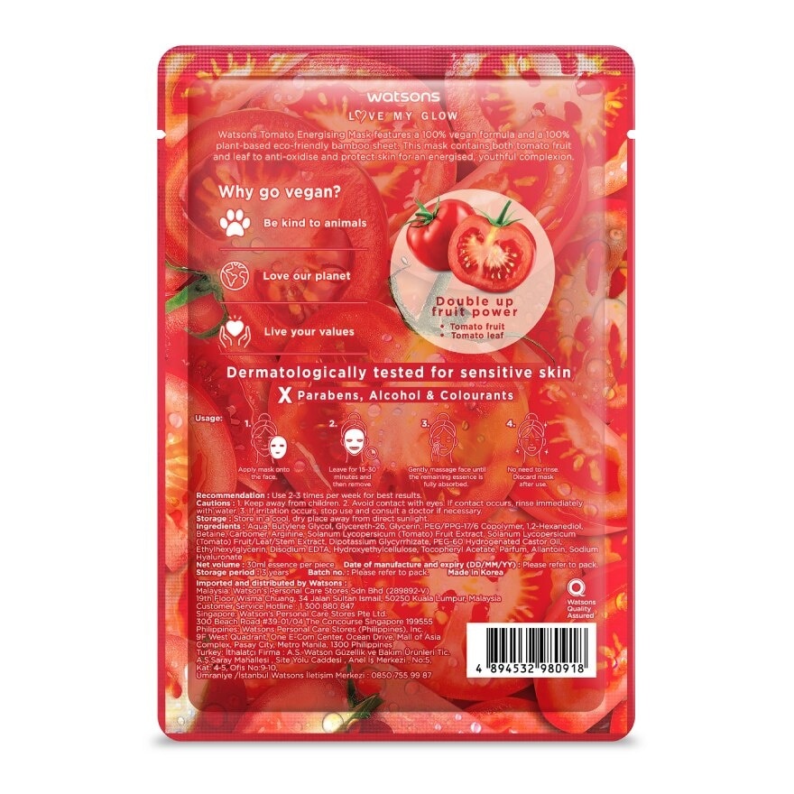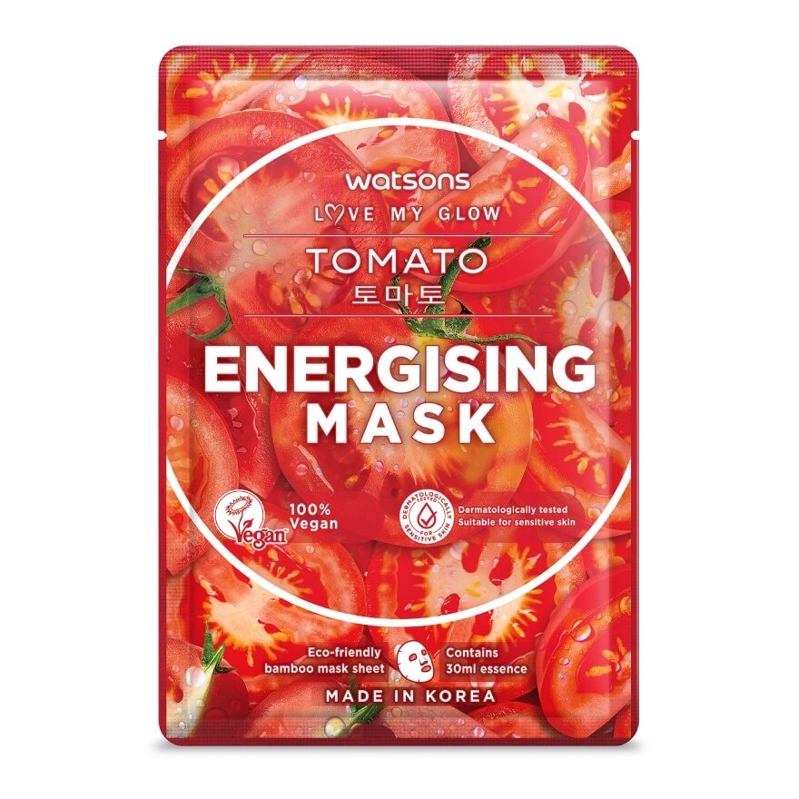 Watsons Tomato Energise Mask features a 100 vegan formula and a 100 plant-based eco-friendly bamboo sheet. This mask contains both tomato fruit and leaf to anti-oxidise and protect skin for an energised, youthful complexion. Free from Parabens, Alcohol amp; Colourants. Contain 30ml Essence. Suitable for sensitive skin. Usage Tips of Sheet Mask Press the mask gently before using to ensure essence mix well with the mask sheet. Use toner or serum before for extra moisture. Do not leave sheet mask on your face over 20minutes as it might cause reverse osmosis.