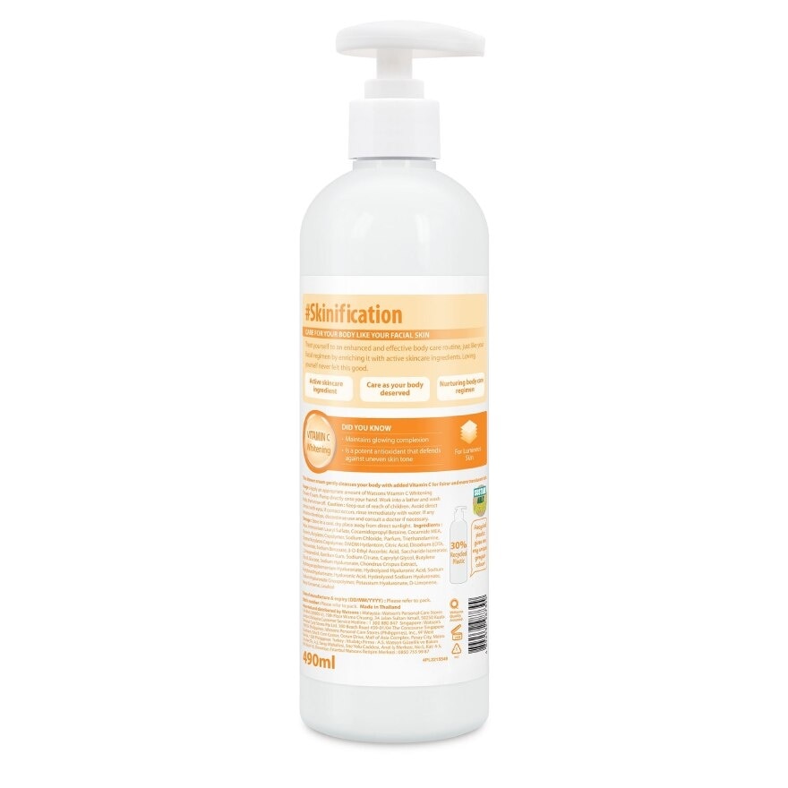 This shower cream gently cleanses your body with added Vitamin C for fairer and more translucent skin. Apply an appropriate amount of Watsons Vitamin C Whitening Shower Cream. Pump directly onto your hand. Work into a lather and wash body, then rinse off. Keep out of reach of children. Avoid direct contact with eyes. If contact occurs, rinse immediately with water. If any irritaition develops, discontinue use and consult a doctor if necessary. Store in acool,dry place away from direct sunlinght.Promote a reduced usage of virgin materials by using recycled content instead.The bottle is made with 30 Post-Consumer Recycled plastic.