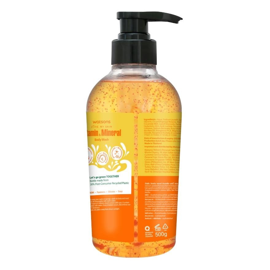Watsons Vitamin & Mineral Body Wash Vitamin C+ Manganese 500g A shower gel that combines vitamins and minerals for skin caring.is sustainable Choices product. Bottle made From 30% Post-Consumer Recycled Plastic. Free From Parabens Silicone and Soap.USAGE : Pump directly onto your palm or sponge, apply on body and work into a lather, then rinse off thoroughly with warm water.Keep out of reach of children. Avoid contact with eyes. If contact occurs, rinse immediately with water. If any irritation occurs,discontinue use and consult a doctor if necessary.