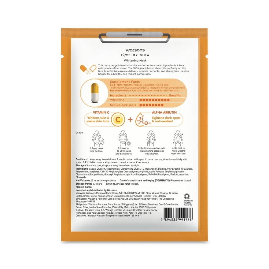 This Watsons Mask range infuses vitamins and other functional ingredients into a natural microfiber sheet. The 100 plant-based sheet fits perfectly on the face to optimise essence delivery provide nutrients and strengthen the skin barrier for a healthy and radiant complexion. Watsons Whitening Mask Contains Vitamin C help to whitens skin amp; even skin tone. Alpha Arbutin help to lightens dark spots amp; anti-oxidant. Free from 8 types of harsh ingredient (Parabens Alcohol Colourants Mineral Oils Triethanolamine Sulfate Surfactants Propylene Glycol Benzophenone.