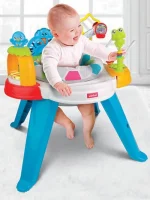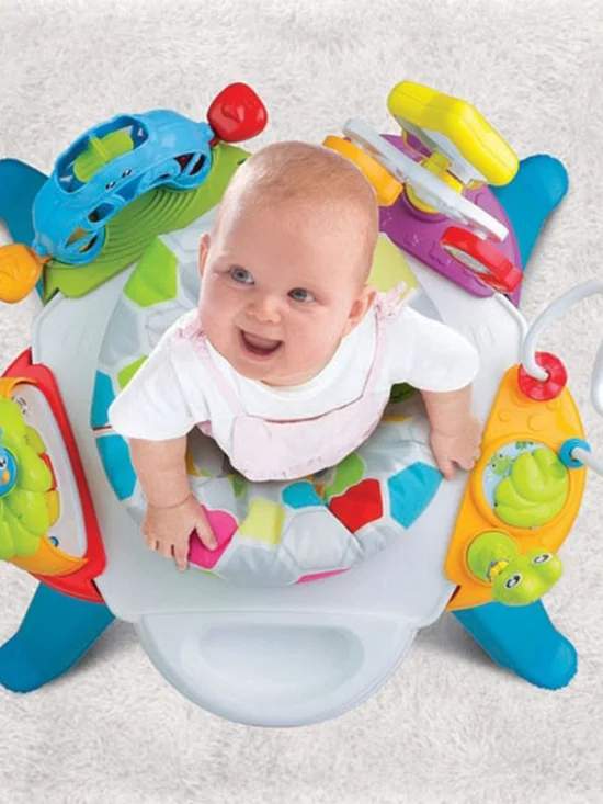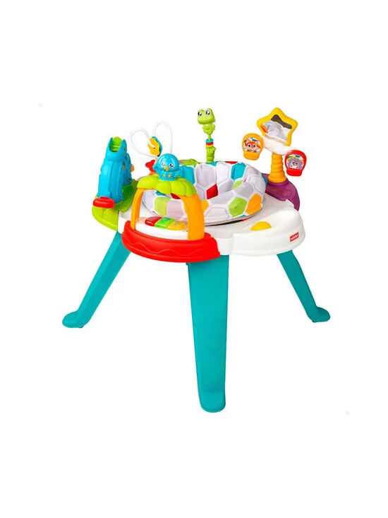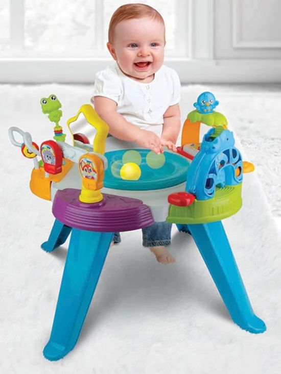 Multi-purpose 2 in 1 activity table toy from the brand WINFUN. 2-in-1 activity center and table. Put baby in the soft seat pad for safe play in the stationary activity center. Includes turning click-clack bird, fun ball popper, spinning ferris wheel, baby-safe mirror, sliding spinners, and froggy rattle. Light-up buttons with happy sounds and melodies. Easily converts from stationary activity center to activity table mode. Features detachable play pieces to customize center and easy-clean snack tray. Suitable for children from 6 months onwards.