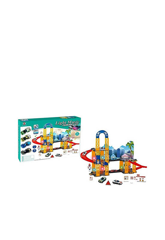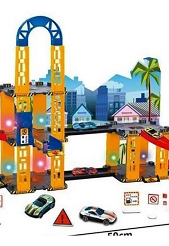 Inside the box, there are more than 52 pieces of equipment, such as scenes, tracks, gas stations, various warning signs, and 4 cars.