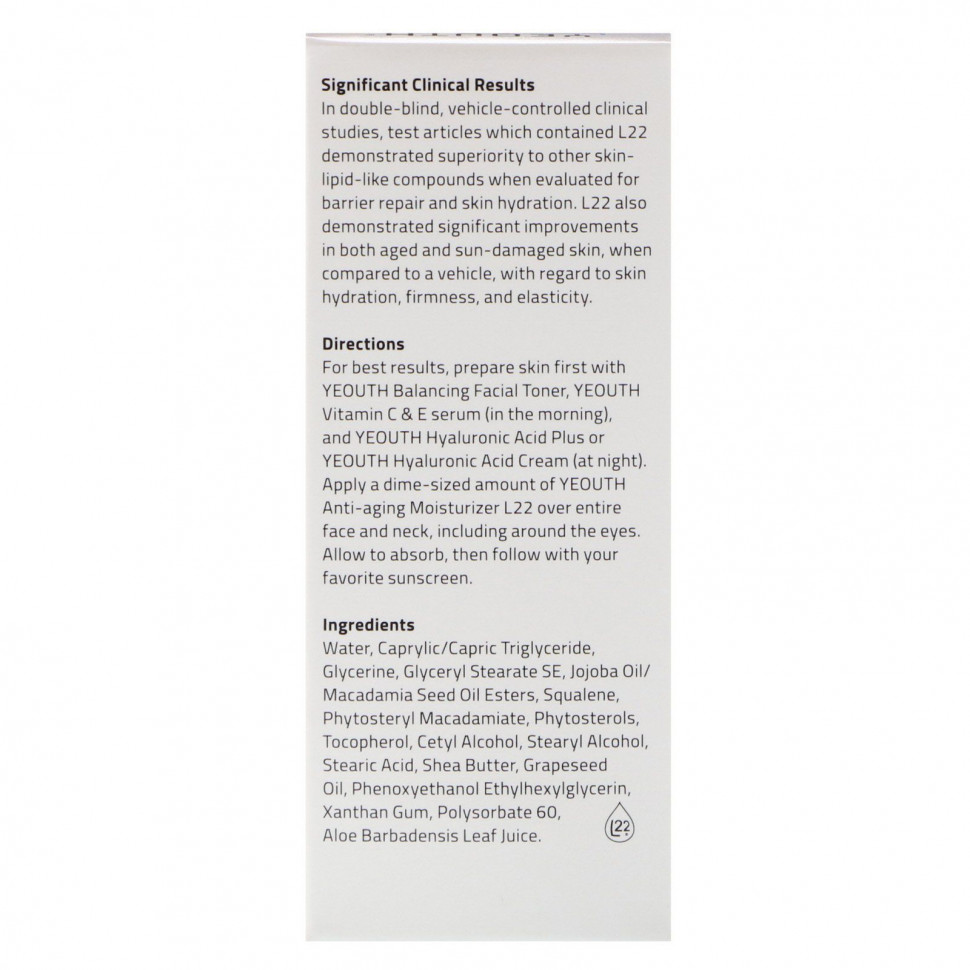 Кожа естественным образом производит увлажняющие масла, которые состоят из нескольких компонентов с идеально подобранным балансом. Согласно исследованиям с возрастом данный баланс изменяется. Защищенный патентом ингредиент L22, входящий в состав антивозрастного увлажняющего крема Yeouth, обладает тем же набором и соотношением жиров, что и молодая здоровая кожа. Используя жиры из растительных источников и тщательно подбирая их состав и соотношение, мы достигает максимального сходства с натуральными жирами, выделяемыми молодой здоровой кожей.