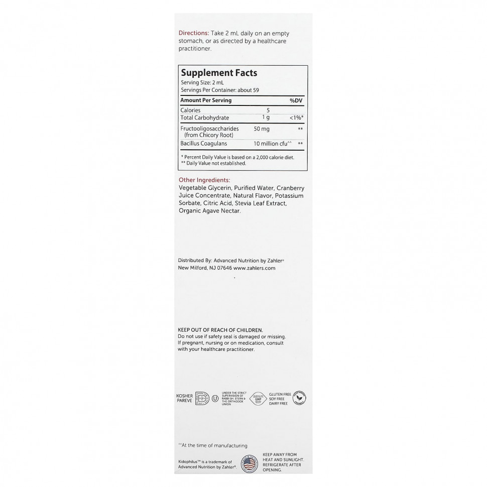 Пробиотики — это «дружественные бактерии», несущие важную пользу для здоровья. Zahler Kidophilus ™ содержит коагулянтную палочку (Bacillus Coagulans), важный пробиотик, который помогает сбалансировать кишечную флору. Bacillus Coagulans обычно используется для поддержания здоровья иммунной системы и улучшения пищеварения.