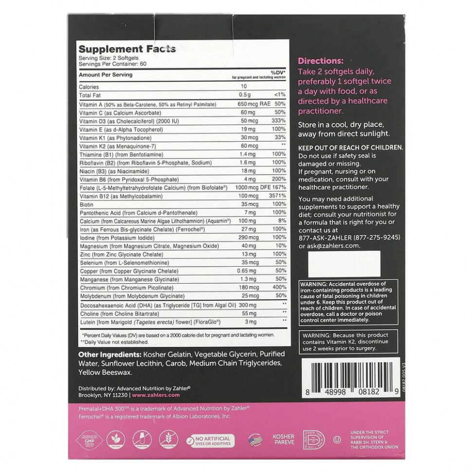 Zahler® Prenatal + DHA — это сбалансированная синергетическая формула, которая обеспечивает тщательно подобранный набор питательных веществ, необходимых вашему развивающемуся ребенку, в оптимальных соотношениях для усвоения, метаболизма и безопасности.