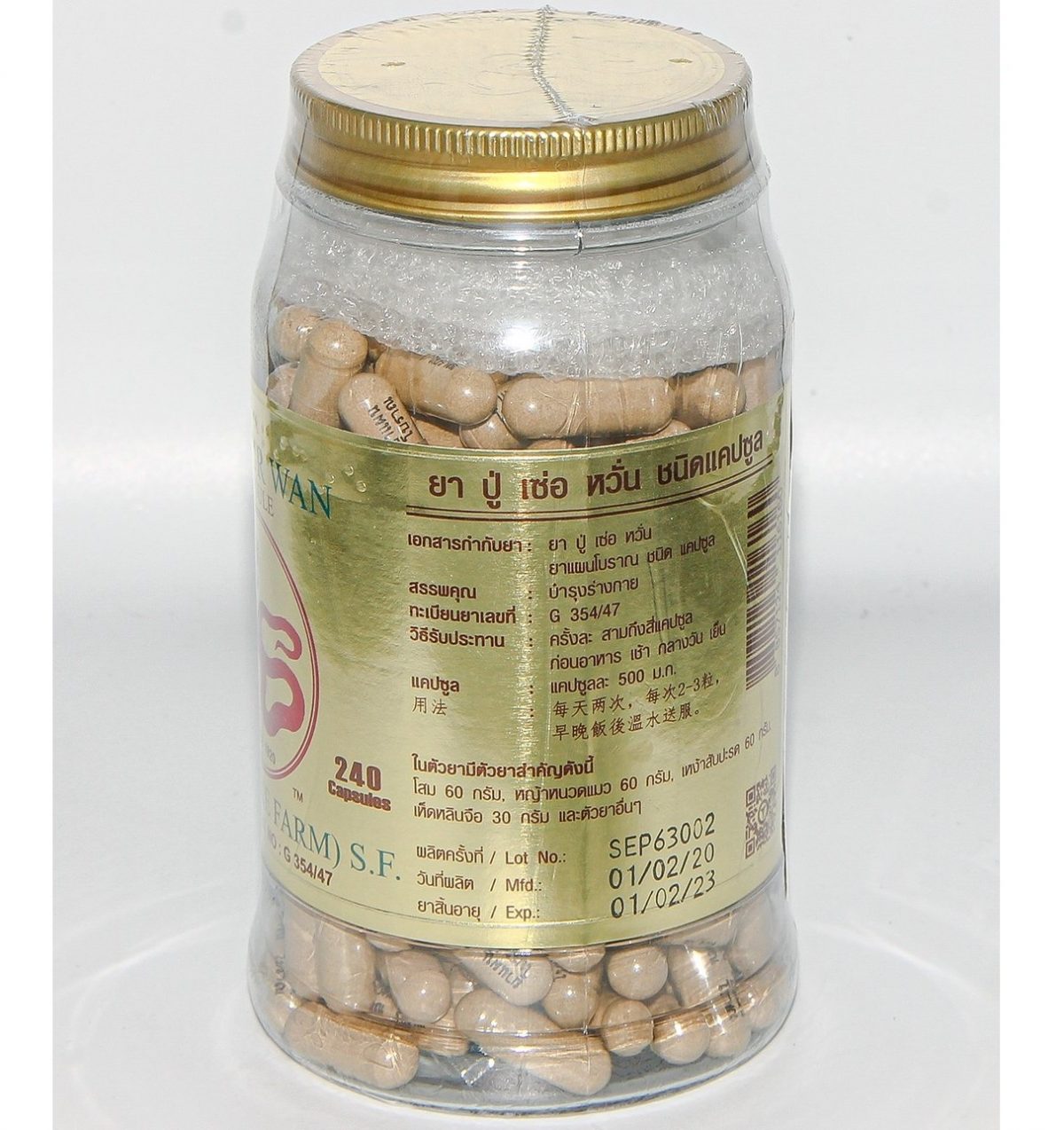 Пу Сур Ван (Ya Poo Sur Wan) – отличное средство для лечения заболеваний мочеполовой системы и для очищения почек. Изготовленное из мяса и костных тканей змей, в сочетании с китайскими и тайскими лекарственными растениями, это средство очень эффективно при, лечении следующих заболеваниях мочеполовой системы и почек: пиелонефрите, почечно-каменной болезни и других случаях нефритопатии, цистит, уретрит. Очищает почки от токсинов, защищает от появления камней. Способствует лечению предстательной железы и нормальной работе почек. Показан для лечения ночного недержания мочи. Быстро купирует похмельный синдром.