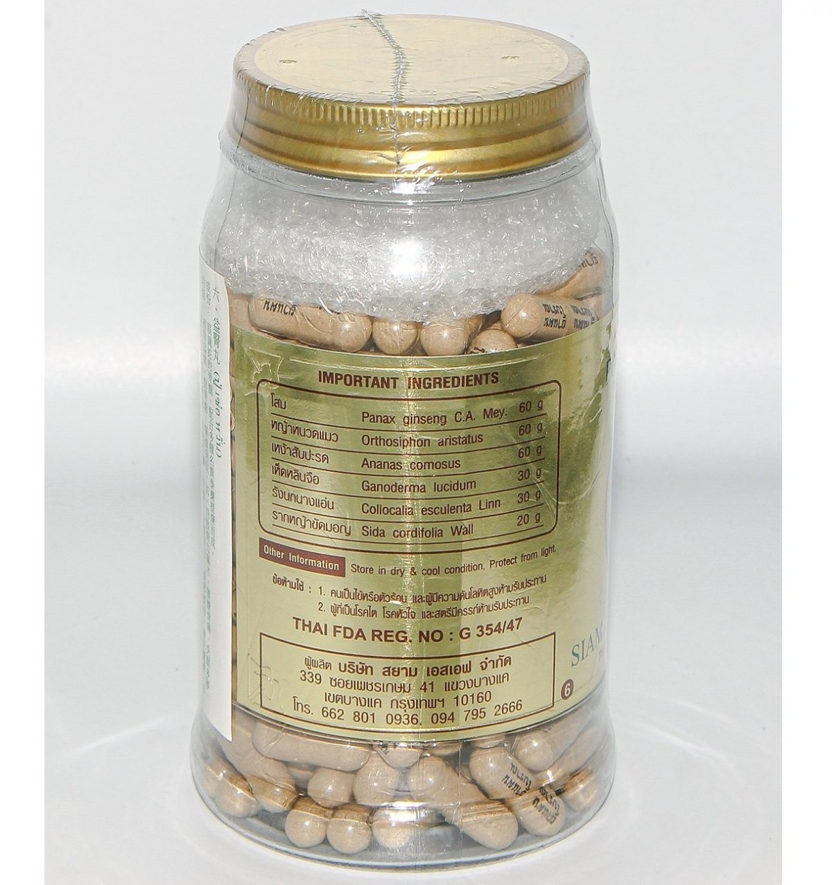 Состав: Panax Ginseng Mey 60 gr, Ganoderma Lucidum 30 gr, Collocalia esculentsa Linn 30 gr, Orthosiphon grandflorus 60 gr, Ananas Comosus Nerr 60 gr, Sida acuta Burm 20 gr