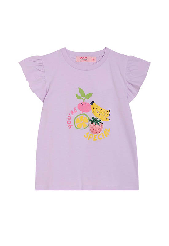 FOF KIDS Girl T-Shirt Frill Sleeves Crew Neck Fruit Print Lavender