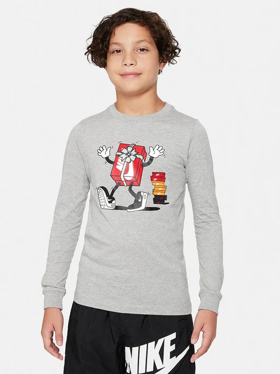 NIKE KIDS Big Kids’ Boy Boxy Print Long-Sleeve T-Shirt FJ6387-063 Dk Grey Heather